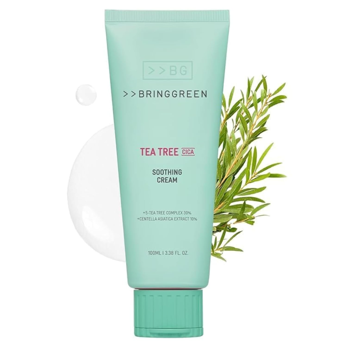 Bringgreen Tea Tree Cica Soothing Cream is a lightweight cream infused with tea tree extract to calm and hydrate irritated skin. It helps control excess sebum while soothing redness and discomfort, leaving the skin balanced and refreshed.
