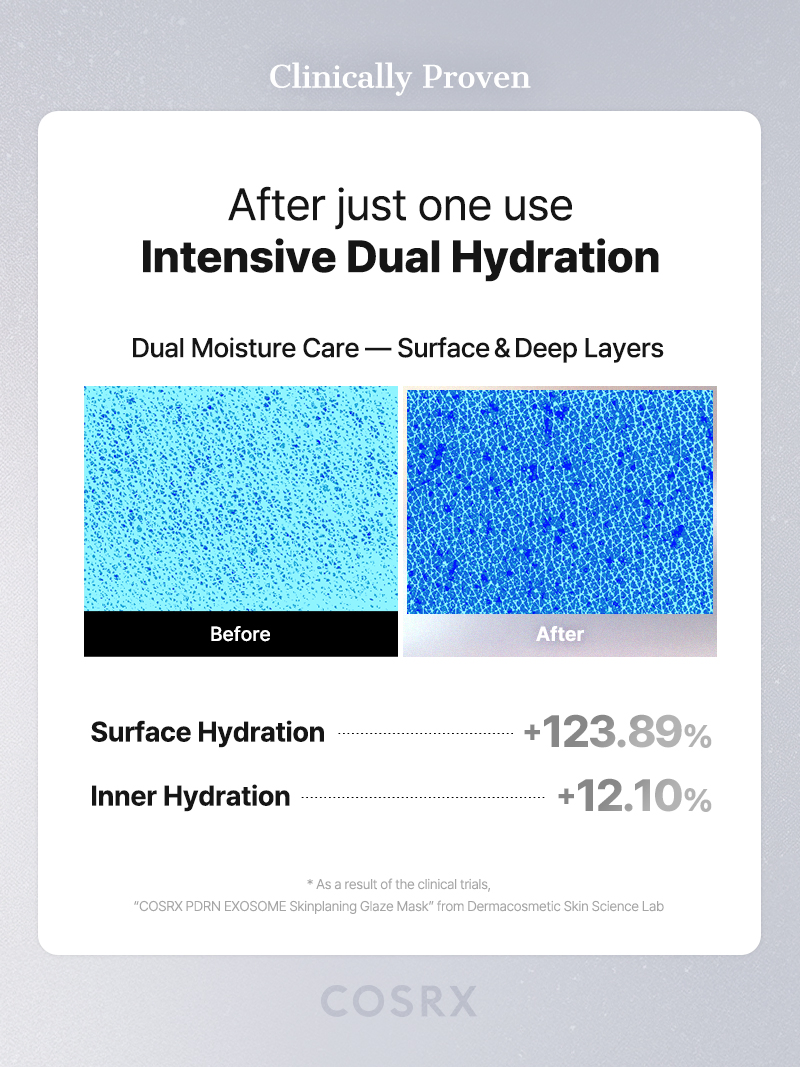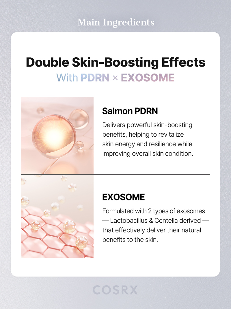 - PDRN + Exosome Synergy Work together to plump, strengthen, and rejuvenate skin from within for a healthy, radiant glow.