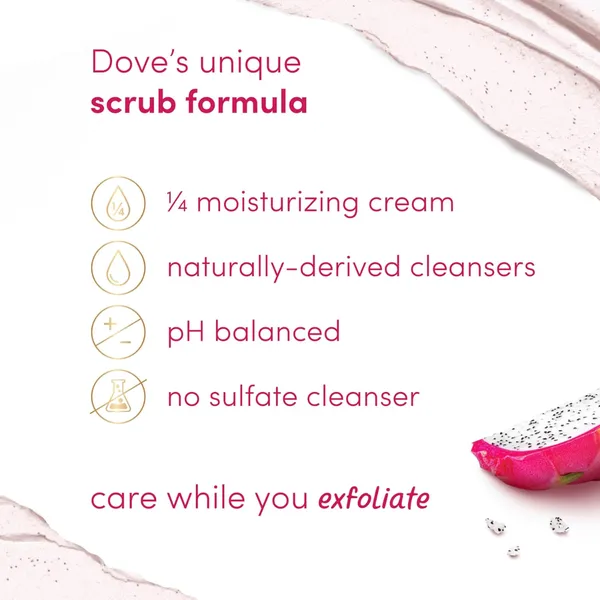 - MOISTURE FORMULA: Only Dove Scrubs are created with moisturizing cream to prepare your skin with this pleasant mix of Dragon Fruit & Coconut
