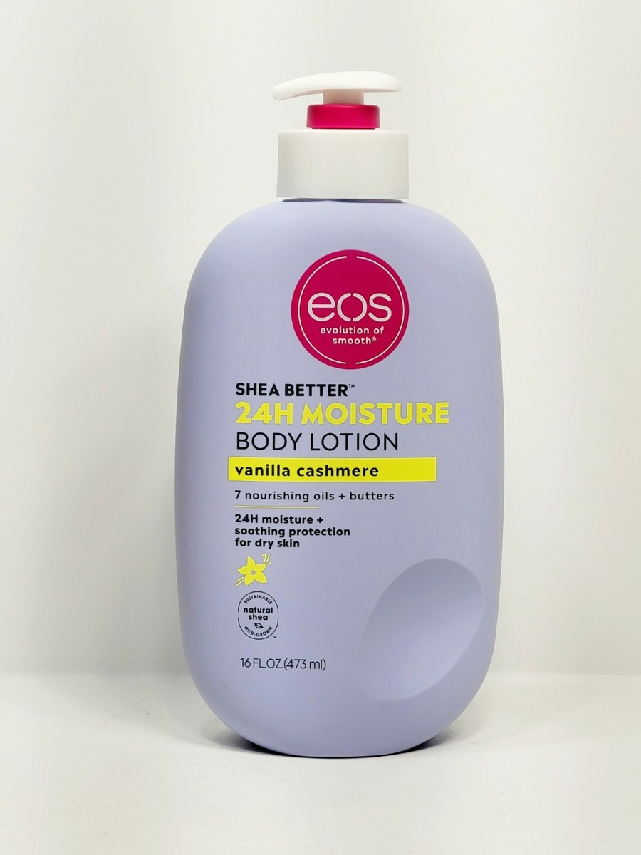 Eos Shea Better 24HR Moisture Body Lotion with instantly moisturizing Shea Oil + lasting protection Shea Butter quickly absorbs for 24-hour hydration. Say hello to… fast-absorption, lightweight, soft skin, and sustainable shea. Say goodbye to… greasiness, heaviness, and sticky residue.