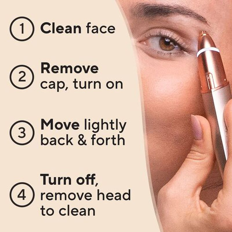 - Electric trimmer features an 18 karat gold-plated head that's easy to use by simply holding the eyebrow face hair trimmer and using it like an eraser for removing hair above, below and between the eyebrows with pinpoint precision